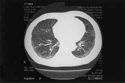 図1は、78歳男性の胸写である。30歳から60歳まで自動車の解体作業に従事し、ブレーキの修理などを行ってきた方で健診目的で来院された。胸部レ線上は下肺野に軽度の線状陰影をみるが、肺容量の減少はない。CT(図2)で両側下葉末梢胸膜直下域に線状・網状陰影を認める。アスベストに関連した職業歴と併せて石綿肺と考えられた。自覚症状はなく、肺機能も異常を認めず、毎年の検診受診と有症状時の受診を勧めた。