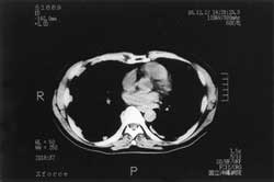 中皮腫の臨床像としては、その発見は呼吸困難と胸痛を契機とする事が大多数である。無症状で検診胸部X線写真で胸水を指摘されることもある。理学所見では病態の進行度によるが、一般に片側性の呼吸音および声音震騰減弱を認める。撥状指は希れである。胸部X線写真では胸水を片側性に認める事が大多数である(図10)。胸膜の肥厚は胸水に隠れ、認めがたいが、CT でみた場合肥厚が明らかな事が多い(図11)。食指不振や体重減少は進行例でみられる。患側肺は腫瘍の進展と共に全周性に固定化され可動性が小さくなり、肺炎を惹起し易くなる。