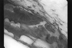 胸膜プラークは、アスベストによる疾患の中で最も特徴的な病変といえる。限局性胸膜肥厚斑とも称される。暴露後約10年以上経過して出現する。胸部X線で、両側第「〜第、肋骨より下方の胸膜に沿って、左右非対照的にほぼ境界明瞭な不規則に突出した肥厚像を認める(図3)。肋横隔膜角が侵されて鈍化することはない。前鋸筋や脂肪織によるcompanion shadowとの鑑別は、前者では斜めに規則的な直線性、後者では左右対照的なところから比較的容易である。CTでみるとプラークの存在は明瞭に認められる(図4)。横隔膜面にもよく発生するが、横隔膜面では外側約2 / 3 の面上に認められ、mushroom capに似た隆起が典型的で、この所見が認められたら、手術歴や外傷、重篤な感染症の既往がないかぎりアスベスト暴露は間違いないとされる。肉眼的には白色調で表面平滑な隆起であり(図5)、病理学的には層板状の硝子化膠原繊維からなっている(図6)。緩除に増大し暴露から30年以上の経過で石灰化が認められるようになるが、プラークは良性であり、特に致命的とはならない。プラークが存在している場合、中皮腫も発生し易いかという懸念に関しては意見の分かれるところで未だ結論はついていないが、大方はプラークの有無と中皮腫発生とは関係ないとしている。後述する自験中皮腫の18例においても、明らかなプラークの存在はなく特にプラークと中皮腫の発生とは無関係との考えを支持するものであった。