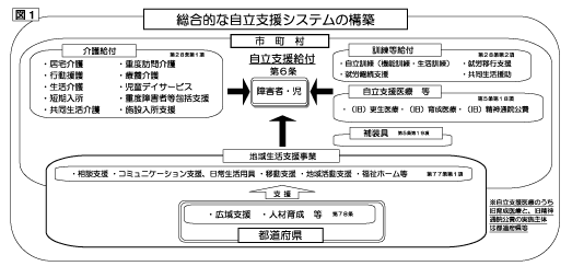 介護給付・訓練等給付等の障害福祉サービス、更生医療・育成医療・精神通院公費の自立支援医療、相談支援事業等の地域生活支援事業等の総合的な支援システムを構築し、障害者の自立を支援していくことにしています(図1)。