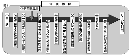 次に、一次判定結果及び医師の意見書に基づき、市町村等に設置される市町村審査会において二次判定を行い、その結果に基づいて市町村は障害程度区分の認定を行うことになります(図2)。