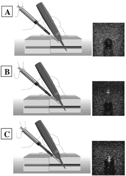 B)穿刺針が、超音波断層像に十分近づくと、超音波の反射・