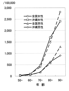 年齢階級別発生率を全国と沖縄で比較するた めに、折茂らと私たちの調査結果を同じグラフ 上にプロットした(図9)。沖縄は80歳代で全 国より高く、90歳代では逆に低下していた。大 腿骨近位部骨折の半数近くは80歳代で生じる ことから、この年代の発生率をいかに抑制する かが今後取り組むべき重要な課題ではないかと 思われた。