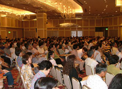 すっかり定着した感のある県民公開講座は、7 月22日(土曜日)午後一時半よりロワジールホ テルの天妃の間において開催されました。開催 前の早い時間から多くの方が詰めかけ、会場は 約800人の聴衆でいっぱいとなりました。会場 を眺めてみますと、実際に麻痺をお持ちの方も 見受けられ、切実な思いが伝わって参りました。 脳卒中に対する県民の関心の高さと、回復へ向 けて、医療に対する大きな期待を窺わせました。
