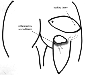 臀部穿通枝皮弁のもう一つの利点は転位皮弁 であることである。健常で瘢痕組織のない皮弁 を転位し充填することで良好な創治癒が期待で きる。V-Y伸展大腿二頭筋皮弁の場合はデブリ ードマンした創縁部が皮弁辺縁部になり充填に 用いられるため、どうしても炎症による硬結を 伴った部分が創閉鎖に使用され創治癒の遅延に つながりやすい(図4)。