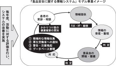 かかりつけ医には、患者からの相談や日常の 診療から知り得た食品による健康被害に関する 情報が蓄積されています。それらの情報を収 集・分析し、対応策をまとめた報告書 を作成し、再び診療の現場に提供して 診療等に役立ててもらう事によって、 身近で頼りになるかかりつけ医機能の 普及・啓発を進めるというのが、本モ デル事業の趣旨です。