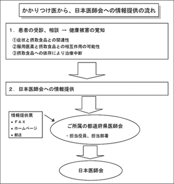 本情報システムにおける情報収集は、かかり つけ医(診療所・病院の開業医・勤務医)から の情報提供に依拠しており、その対象となる情 報は、主として「いわゆる健康食品」に関する ものです。