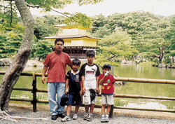 平成16年夏休みの家族旅行は、京都へ行き ました。初日は、伊丹空港からバスを利用し、 夕方にJR京都駅前に到着しました。JR京都駅 に直結するホテルグランヴィア京都に2泊しま した。1日目の夕食は、ホテル内の日本料理店 (吉兆)個室で、会席料理をゆったりと頂きました。2日目は、観光バスで金閣寺、銀閣寺、 清水寺を、駆け足で見学しました。2日目の夕 食は、京都の夏の風物詩と言われている鴨川の 納涼床(のうりょうゆか)を楽しみました。先 斗町の床で鴨川の流れを耳にしながら料理を味 わいました。3日目は京都駅から新横浜駅まで 新幹線に乗り、今回は私も鎌倉で1泊しました。 私は3泊4日で沖縄へ帰り、妻と子供達は、あ と3泊程妻のいとこ宅でお世話になりました。