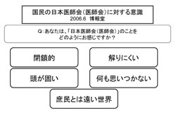 日本医師会で調べてみたんですね。例えば、「あなたは日本医師会ということは、どういうふうに感じますか」と聞いたら、「どちらともいえない」「あまり好きでない」「嫌い」まで合わせると96.6%なんですね。要するに好意的に思っていらっしゃる方はほとんどいないということですね。日本医師会はびっくりしました。