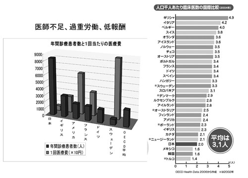 治療費というのは高い感じが受けられるかもしれませんが、これを見ればわかるんですけれども、日本の医療費は欧米各国と比べて一番低いですね。その割には医師の労働時間が非常に長い。右側にOECDの各国の棒グラフがありますけれども、平均は3.1人ですけど、日本は2.0人ですね。下から4番目です。