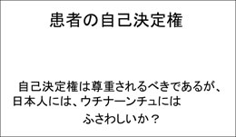 スライド17:その理由は、患者の「自己決定 権」の問題は、終末期医療の問題を含めて、日 本ではまだまだ成熟していないし、また必ずし も欧米のような自己決定権の概念は成立しない し、また日本の風土にふさわしくないのではな いかと考えております。やはり、患者さんとそ の取り巻きとの関係で考えて決定していくのが より沖縄的だと思いますが、会場の皆様方いか がお考えでしょうか。