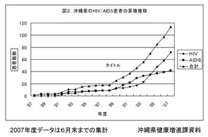 本県と全国の動向を比較すると本県の急激な 増加は全国のそれを凌駕する勢いで伸びている ことがより明らかとなる。最新の8月度のエイズ動向委員会報告(4〜6月度集計)では、沖 縄県は実数で全国5位、人口で補正した報告数 は東京都とほぼ同じで全国2位である。このよ うな状況から沖縄県は厚生労働省より、 HIV/AIDS患者が急増している地域として2006 年2月に重点支援地域に指定されている。