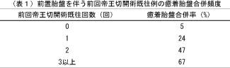 Clarkeらの報告では、帝王切開術既往がない 前置胎盤例では、癒着胎盤の可能性が5%程度 に対して、既往帝王切開術1回に前置胎盤が合 併する場合、癒着胎盤の可能性は24%、既往 帝王切開術3回以上に 前置胎盤が合併する 場合、67%に達する。 (表1)2)