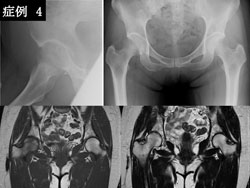 症例3 : 36 歳、女性。SLE にてステロイド剤投 与を受けています。右股部痛にて受診。単純X 線 にて異常は認めませんが、MRI では両大腿骨頭に T1T2 強調画像で低信号域の壊死像を認めます。