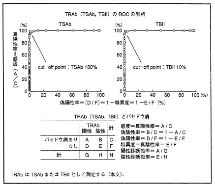 ³ílÅÍTBII Í0 ðs[NÉATSAb Í100 ðs[NÉÆàɳKªzðŠ·B¢ ¡ÃoZhEa³ÒÌTBIIATSAb ̪z𠊵œi}2j7,8jBROC ireceiver operating characteriticjðÍðs¢ATBIIATSAb ÌŽxAÁÙx𢵜i}3j7jBTBII Ì cut-off lÍ10 ATSAb Í180 Å éBŽ xAÁÙxÆàÉDêÄ¢éBTBII Ìcut-off lð10 ATSAb ð180 ÆßATBIIA TSAb Ìz«Šðärµœi\2j7,8jB¢¡Ã oZhEa³Ò283 áÅTBII A«»µÄ T S A bis T S A bjA«Å ÁœÌÍ1 0 á i3.5 jÅ ÁœB¢¡ÃoZhEa³Ò283 á273 ái96.5 jÅTBII é¢ÍTSAb isTSAbjªz«Å ÁœB¢¡ÃoZhEa ³ÒÌ9 6 . 5 ÅT R A b ªz«Å ÁœB TRAb ÍoZhEaÌŽöÅ éBTBII Ì cut-off lÍ10 ATSAb Í180 Å éB¢ ¡ÃoZhEa³Ò96.5 ÅTBII ÜœÍ TSAb ªz«Å ÁœB
