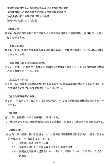 本協定は、災害により傷病者が短時間に集団 的に発生した場合、沖縄県地域防災計画に基づ き、沖縄県が沖縄県医師会に対して医療班の派 遣を要請する出動の手順等を定めるもので、本 会が、福祉保健部との定例連絡会等において早 期の締結を再三要望してきたものであります。