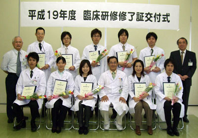 新臨床研修医制度発足から5 年が経過しまし た。全国各地の臨床研修医指定病院から、3 年 前より後期研修医(専修医)として各地の医療 機関に巣立っています。当院でも今年は3 期生 10 名の前期臨床研修を修了し、昨年7 月に“所 謂『壽』中断”の1 名が3 か月遅れではありま したが、無事研修を終了し平成19 年度は11 名 の前期臨床研修修了医が巣立ちました。