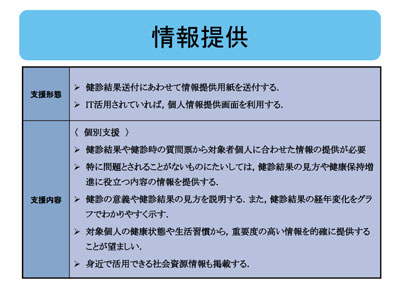 情報提供というのは、先ほども言いましたよ うに、全受診者が対象ですから保険者が郵送も しくは医療(健診)機関から配送される場合も あると思います。