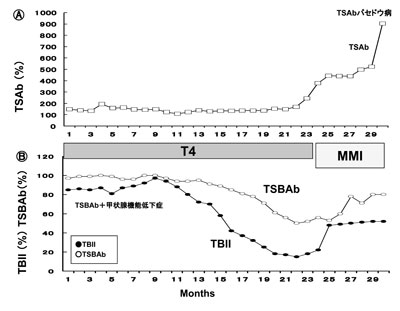 ƒoƒZƒhƒE•aгŽÒ‚ðI131 •úŽËü‚ÅŽ¡—·‚邯A ƒuƒƒbƒLƒ“ƒOR‘ÌiTSBAbj‚ªoŒ»‚µAbó ‘B‹@”\’ቺǂɂȂé—Ⴊ‚ ‚éBI131 •úŽËüŽ¡—à ŒãTRAb ‚ª‚’l‚ɂȂé—Ⴊ‚ ‚éB‚±‚ê‚ÍI131 ‚Å bó‘B‚ª”j‰ó‚³‚êAŒŒ’†‚Ébó‘B‘gD‚ª—¬o ‚µA‚»‚Ì—¬o‚µ‚½bó‘B‘gD‚ªRŒ´‚ƂȂÁ‚ÄR‘Ì‚ðì‚éBI131 •úŽËü—Ö@‚ªŽ©ŒÈ–Ɖu«bó‘B ‰Š‚ðˆø‚«‹N‚±‚·B‚Ü‚½ˆŸ‹}«bó‘B‰Š‚ÌŒã‚É TSBAb ‚ªo‚Ä‚«‚Ä‹@”\’ቺǂɂȂé—Ⴊ‚ ‚éB