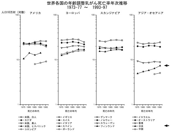 本邦女性の乳がん生涯リスクは2001 年度の 統計で5.1 %(20 人に1 人)(表1)で、罹患率 は年々増加している(図2)。1999 年と2003 年 の罹患率を比較した沖縄県のデータを見ても、 乳がんの罹患率の増加はあきらかであり(図 3)、2007 年現在では全県的に年間約600 件の 乳癌手術が行われたと推定される。また、乳癌 による死亡率は他の癌種が横ばいまたは減少傾 向を示す中で、未だ増加傾向にある(図4)。そ して、本邦においては乳がんの発症のピークが40 代、50 代と女性が社会の中また家 庭の中でもっとも活躍する年代にある というところが、他のがん種や欧米と 違うところである(図5)(図6)
