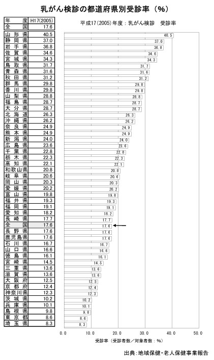 本邦の乳癌検診受診率は2005 年度の調べで 17.5 %と、欧米諸国と比較すると極端に低い。 その中で沖縄県の受診率は26.2 %と比較的高 い中に入っている(図9)。これは、マンモグラ フィ検診が厚生労働省通達で推奨された2000 年に、マンモグラフィ検診には欠かせないマン モグラフィ撮影技師と読影医師養成のための 「マンモグラフィ講習会」が全国6 カ所の中の 一つとして本県で開催され、その早期の取り組 みにより撮影・読影資格者の確保を得て、2003 年度よりこの制度に基づいたマンモグラフィ検 診が開始できたことなどによると考えられる。