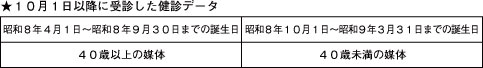 つきましては、10 月1 日以降誕生日を迎え る方が、10 月1 日以降に受診した健診データ は、40 歳未満の媒体に格納しご請求くださ るよう、協力方よろしくお願いします。
