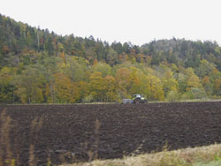 北の大地を開拓する1 台の耕運機を前にして、幾重もの紅葉に 彩られる山々です。