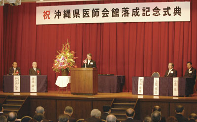 沖縄県医師会館の建設が無事終了し、本日祝 賀会ができることを非常に喜んでおります。会 館が出来るまでの経過については、先程真栄田 常任理事から縷々説明して頂きました。会館が できる下地というのは、先輩方が土地を取得す るために毎月1 万円を積み立ててきたという経 緯があったから、今回の会館ができあがったと いうことです。一番多く払った会員の先生方は 108 万円納めています。それが積もり積もっ て、土地を購入して更に2 億円残ったというこ とです。これが今回の会館建設の大きな力にな ったということで、先輩方に非常に感謝したい と思います。それがあって始めて、現在の会員 に対しては、そんなに大きな負担を掛けずにで きあがったということです。