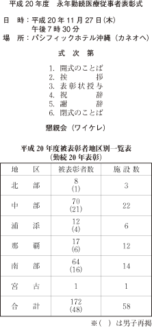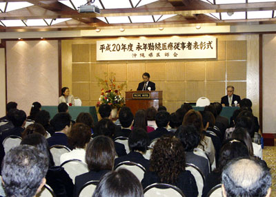 去る11 月27 日(木)午後7 時30 分からパ シフィックホテル沖縄に於いて、平成20 年度 永年勤続医療従事者表彰式が行われた。