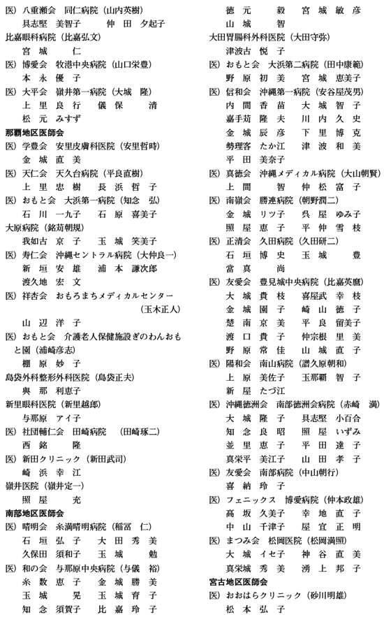 始めに、宮城信雄沖縄県医師会長から受賞者 への挨拶として「国が長年にわたり進めてき た、財政至上主義による社会保障費、特に医療 費の抑制策は、深刻な医師・看護師不足や、周 産期・小児・救急医療の弱体化を招き、我が国 の医療はかつてない危機的な状況に追い込まれ ており、医療崩壊・介護崩壊が各地で起こって おります。