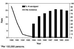 Fig.1 Incidence rate* of Haemophilus influenzae type b(Hib) invasive disease and percentage of Haemophilus influenzae (Hi) isolates serotyped among children aged <5years − United States, 1990 − 2000 5)より