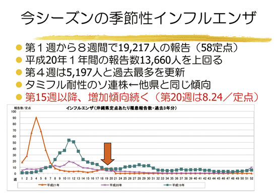 新型インフルエンザに関しては恐怖感ばっか りが忍び寄るところがあるんですけれども、感 染力と毒性という意味では、幸いなことに毒性 がどうも弱いらしいと。幸いなことにタミフ ル、リレンザが効くらしいと。それから、幸い なことに沖縄は梅雨入りをしたということで す。幸いなことに沖縄は鉄軌道がないというこ とがありますので、糸数先生がおっしゃったよ うに、沖縄県はよそと違って鉄軌道がない分、 移動が少ない分、外出をきちんと守ってくれれ ば、ほかの県と違って爆発的に増えないだろう という想定もされております。