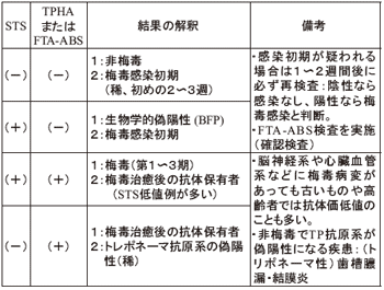 感染初期はトレポネーマ・非トレポネーマ抗 原検査いずれも陰性となります。感染後約1 〜 2 週間後にTP に対するIgM(FTA-IgM)抗 体が産生され、その後IgG(FTA-IgG)と STS がほぼ同時に陽転し、TPHA が最も遅く 陽転する傾向があります。そのため、STS 陽 性・TPHA 陰性の場合は生物学的偽陽性とと もに感染初期の可能性もあり、感染が強く疑わ れるような症例では2 〜 3 週間後に再度検査を 行って判断することが必要です。