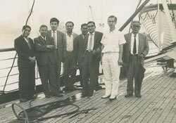 1962 年5 月: 40 日の航海の後、サントスに上陸した筆者 (左から3 人目)を迎えた、在伯沖縄県人会の先輩たち。白服 の紳士は通訳、世話人の中国人。