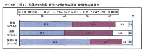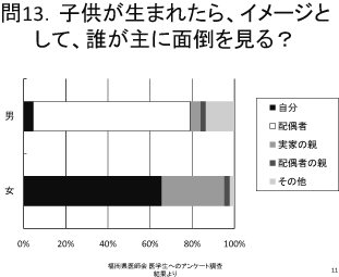 当院では女性医師が子育てをしながら働ける 環境を目指しているが、そのためには、他の男 性医師の理解(当直等)も必要である。
