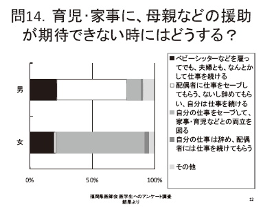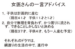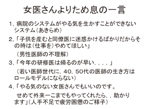 精神的な支えとなる言葉に女性医師はしがみ 付くことがある。人生の岐路にたち、大きな不 安を抱えている際に、不安を増幅させるような 言葉を投げかけられると心が折れてしまう。育 児は女性医師特有の問題ではない。育児にかか わりたいと思う男性医師にも理解をお願いした い。全体の問題として扱って頂きたい。