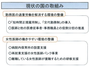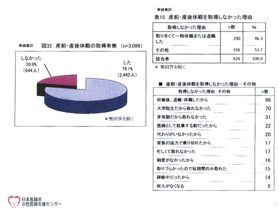 看護師の場合、公務員法で守られているため 産休育休の取得ができるが、女医に関しては産 休は取れても育休は難しい。実際は祖母に見て もらうなどの対応をしているかと思う。