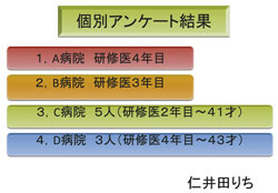 当院では、院内保育所を作った。一昨年新館 を建てた際に女性医師専用の部屋を設けた。ま た、今年初めに当直室も設置した。医局の隣に は研修医専用の部屋も作った。環境は整ってき ているが、女性医師が少なく大きな問題にはな っていない。