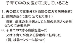 全ての科の状況を把握している訳ではない が、内科や外科の女医は子供の手のかかる間は 当直免除の措置を受けている。また、産婦人科 でも職場復帰に際して1 コマだけでもやって貰 えたら自分達が楽になるのでありがたいと、上 司に言われ感激していた。