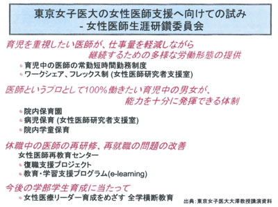 女性医師の問題といわれている大部分は女性 医師特有の問題ではないと考えている。基本的 には育児をしたい男性医師も含まれると考え る。そのため、女性も男性も生き生きと働き続 けられる病院、職業人であり、生活者であるこ とが両立できる病院を目指すためには、1)院 内病児保育、2)緊急的託児サービス、3)地域 の小児デイケア、学童保育、ファミリーサポー ト事業等との組織的連携、4)生活日用品共同 購入支援などの措置を講じることが必要であ り、それが男女共同参画や育児支援に繋がる。