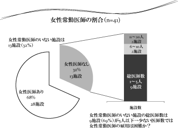 ● 常勤女性医師のいない施設は13施設(32%) であり、そのうち9 施設(69 %)が医師数1 〜 5 人の施設であった。→少ない医師数では 常勤女性医師の雇用は困難か?その場合の困 難である理由は何か?