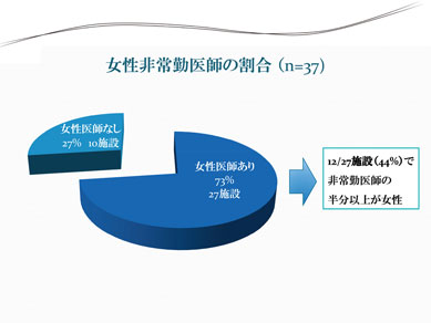● 非常勤女性医師のいる施設は27施設(73%) で、さらにそのうち12 施設(44 %)で非常 勤医師の半分以上が女性医師であった。→非 常勤女性医師の声