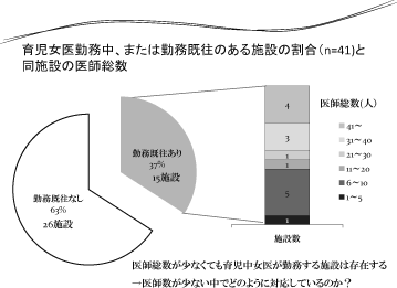 ● 育児中女性医師の勤務している施設、または 勤務既往のある施設は15 施設(37 %)であ り、その中には医師総数が10 人以下の施設 も6 施設存在した。→医師数が少ない中でど のように対応しているのか?