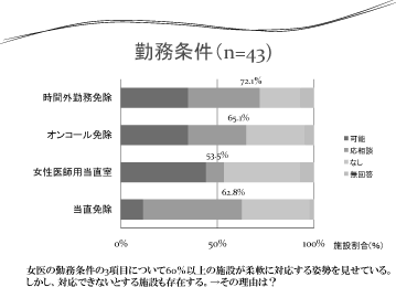 ● 女医の勤務条件の3 項目について60 %以上 の施設が柔軟に対応する姿勢を見せている。 しかし、対応できないとする施設も存在す る。→その理由は何か?