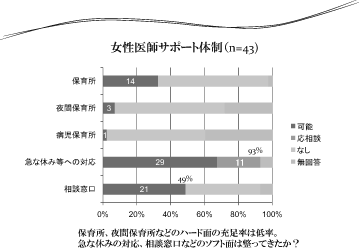 仕事の内容については、男女を問わずチーム 医療で行っているため、欠員時のカバーは出来 る体制にある。院内保育所設置に関しては、要 望があったとしても院長個人の裁量では決めら れない。採算性も検討しなければならないた め、地域と連携した対応がベターかと思う。