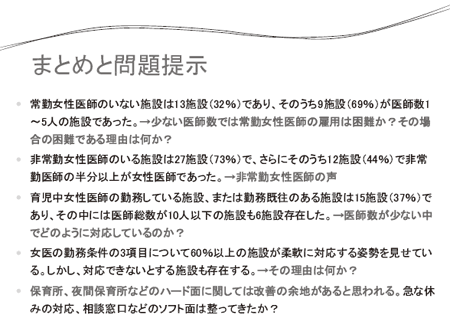 しかし、現場において時間外免除や急な休みを申し出るのは勇気が必要だ。その結果、同僚医 師へ負担がかかることを憂慮し辞職を選択したり、復帰をためらっている女性医師は多いと思う。 同僚医師へ負担がかからないように、医師の補充がなされなければこの問題は解決できないし、 専門性が高いほど補充は容易ではなく、医師不足が深刻な現在の状況で解決は困難であることが 予想された。女性側の問題点が語られることは少なかったが、施設側が女性医師の就労環境につ いてこれだけ取り組む姿勢を見せている以上、女性側の意識改革も必要であると感じた。育児は 子供が成長すればいずれ卒業するものだが、医師に卒業はない。女性医師は女性であると同時に 医師であるということを忘れず、一旦休んだことを恐れずに、復帰して欲しいと思う。