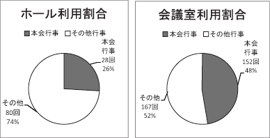 理事会室は34 回使用、中講堂(ホール)は 108 回利用、会議室は4 室で319 回利用してい ます。会議室は本会行事としては48 %、その 他の行事として52 %占めています。