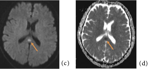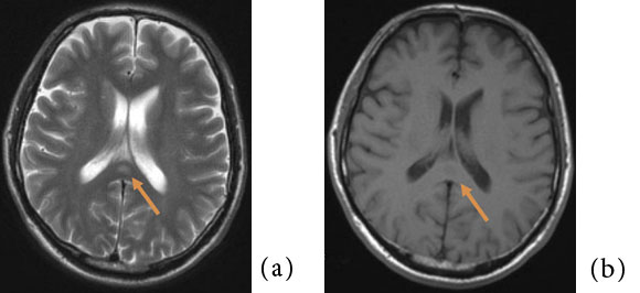 (a,b):脳梁膨大部に卵円形の淡いT2WI 高信号、T1WI 低信号域を認める (矢印)。明らかなmass effect は認められない。