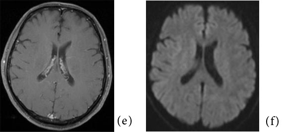 (c, d):同病変は拡散強調像にて高信号(矢印)、ADC map にて低値を示し (矢印)、拡散低下が示唆される。