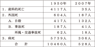 同様にして病死に関しても同じ試算を試みる と、1950 年には産科的死亡4,117 名に対し病 死が5,739 名と約1.4 倍だったものが、2007 年 には産科的死亡35 名に対し病死306 名と約9 倍を占めており、病死の割合がこの60 年間で 相対的に約6 倍増加しているのである。
